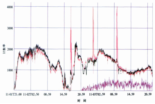 | 图 4. 风云二号气象卫星2003年11月1日21:00至3日23:00数据 (黑线为软X射线, 红线为硬X射线, 紫线为P1能道的质子) Fig 4. Observinging result of FY-2 satellite solar X-ray detector from 21:00 on Nov 1 to 3 23:00 on Nov 3, 2003 (black line:the soft X-ray; red line:the hard X-ray; purple line:the high-energy particles channel P1) | |