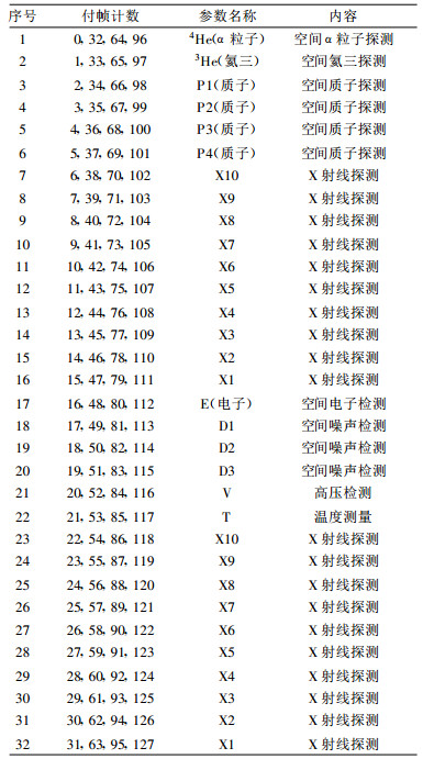 空间环境探测数据包括空间粒子探测器和太阳X射线监测仪两台仪器的探测数据及空间噪声检测、高压检测、温度测量的数据共32路。空间粒子探测器实时监测7道高能带电粒子:α粒子, 3He, P1, P2, P3, P4和E。太阳X射线监测仪监测太阳软、硬X射线暴, 共分10个能道:X1~X10。32路空间环境探测数据的详细内容列在表 2中。