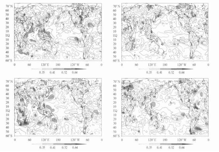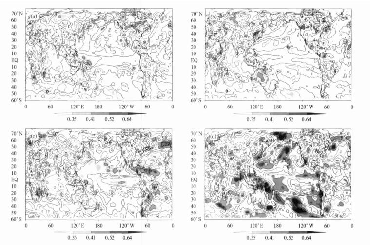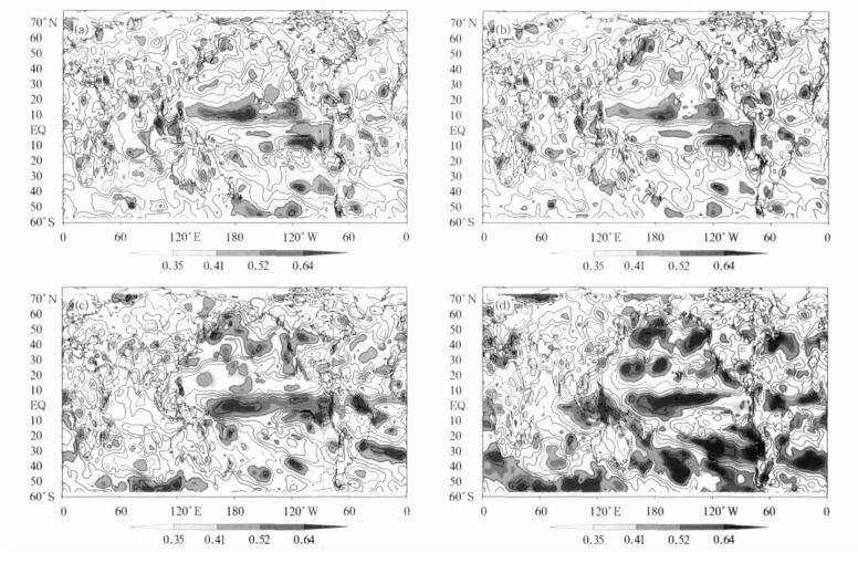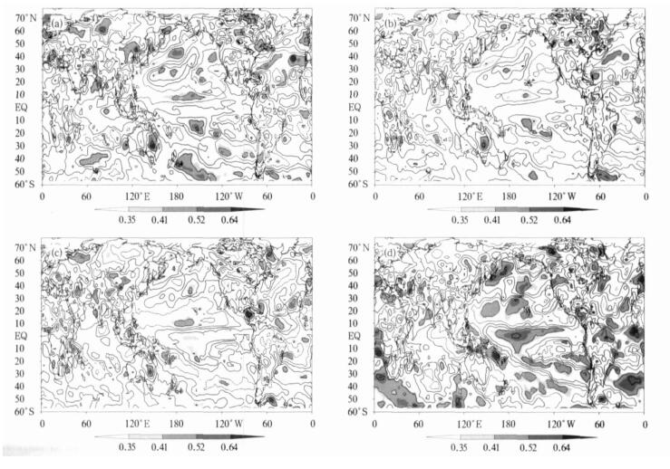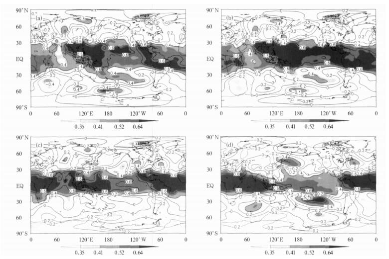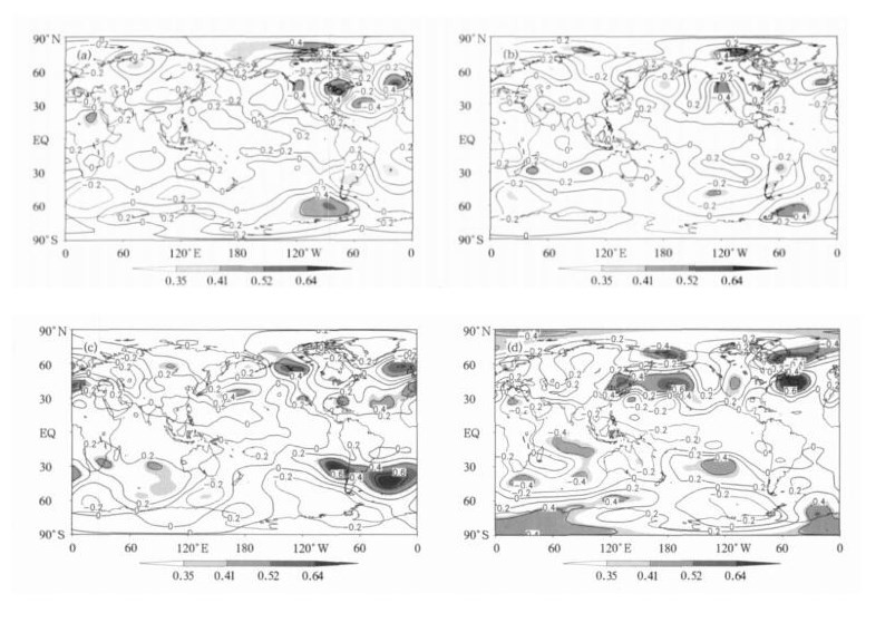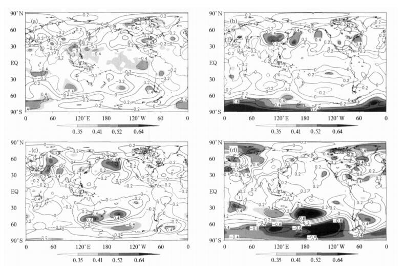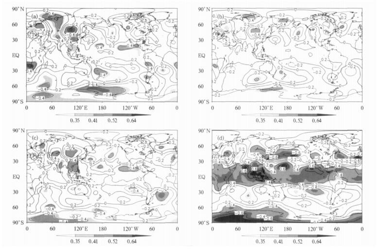 | 图 1. 前期秋季 (a)、冬季 (b)、春季 (c) 和同期夏季 (d) 的Niño3区海温指数与夏季500 hPa高度预报误差相关分析 (阴影层次的相关系数0.35, 0.41, 0.52和0.64, 分别对应着0.1, 0.05, 0.01, 0.001的t检验显著性水平, 下同) Fig 1. TCCs between the prediction errors of summer mean 500 hPa geopotential height and the early autumn (a), winter (b), spring (c) and simultaneous summer (d) NINO3Is respectively (where numbers 0.35, 0.41, 0.52 and 0.64 stand for levels of 0.1, 0.05, 0.01, 0.001 based on Student's t-test, respectively) | |
