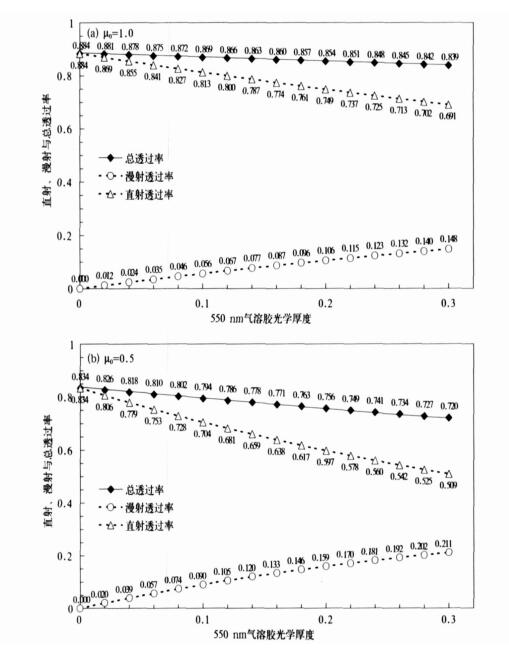 2) 直接和散射辐射随光学厚度的增大有不同的变化方向, 前者变小, 后者反而变大, 使得总辐射 (或透过率) 对气溶胶和分子光学厚度、气溶胶谱分布和折射率的敏感性比较弱。