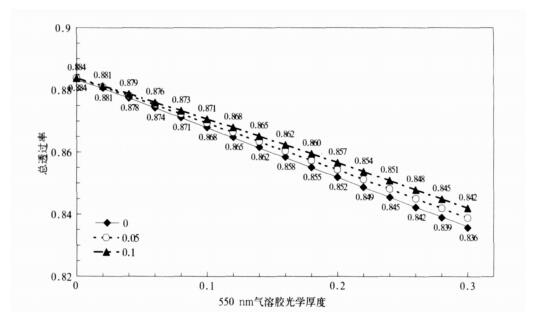 | 图 2. 对于0, 0.05和0.1不同地表反照率, 宽带 (0.3~3 μm) 太阳辐射总透过率随550 nm气溶胶光学厚度的变化 Fig 2. Broadband (0.3—3 μm) transmittance of global solar radiation versus 550 nm wavelength aerosol optical thickness for three wavelength-independent surface albedo values of 0, 0.05 and 0.1 | |