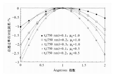 图 3表示由谱分布 (Ångström指数) 不确定所引起的总透过率计算误差, 图例中的τa和μ0分别为750 nm气溶胶光学厚度和太阳天顶角余弦。光学厚度越小而μ0越大, 透过率误差越小。在τa≤0.2而μ0≥0.5条件下, 透过率对谱分布变化的敏感性是弱的。如果Ångström指数误差在±0.4以内而μ0=1.0, 透过率误差小于0.38%, 对μ0=0.5, 最大误差为0.57%。对τ=0.1和μ0=1.0情形, 即使Ångström指数误差高达1或-1, 透过率误差也在1.05%以内。
