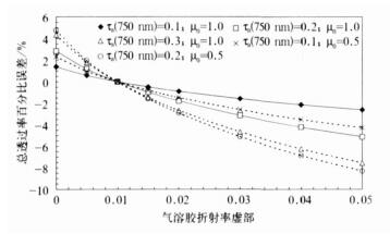 如图 4所示, 总透过率对折射率虚部的敏感性也随光学厚度的变小和μ0的变大而变弱。如果该虚部的误差在±0.005以内, 当τa≤0.2而μ0分别等于1和0.5时总透过率的误差分别在±1.19%和±1.97%以内。比较谱分布的情形, 虚部误差对透过率计算的影响略大一些。只要虚部的误差在±0.005以内而τa/μ0小于0.2(或0.3), 所引起的透过率误差在±1.19%(或±1.8%) 以内。此外, 当虚部偏小时, 透过率被高估, 而虚部偏大, 则透过率被低估。