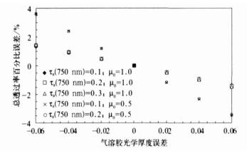 如图 5所示, 当光学厚度较小而μ0较大时, 总透过率对光学厚度误差的敏感性是弱的。当光学厚度的误差在±0.02以内、τa≤0.2而μ0分别等于1和0.5时总透过率的误差分别在±0.47%和±1.2%以内。只要τa/μ0小于0.3, 光学厚度的误差在±0.02和±0.04以内时, 所引起的透过率误差分别在±1.2%和±2.4%以内。