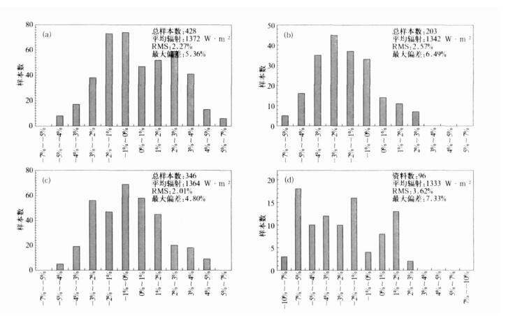 图 7表示在额济纳旗、乌鲁木齐、格尔木和北京4个站, 太阳常数反演值E0, P对WRR的相对偏差在不同的偏差范围内样本数分布。额济纳旗、乌鲁木齐和格尔木3个站样本数分布呈近似正态分布的特点。额济纳旗样本数分布峰值出现在-2%~0%偏差范围内, 428个E0, P值的平均值为1372 W·m-2, 对WRR的偏差0.35%。乌鲁木齐的样本数分布峰值出现在-3%~-2%偏差范围内, E0, P平均值为1342 W·m-2, 对WRR的偏差为-1.8%。如图 7d所示的北京样本数分布, 总样本数相对较少, 平均值对WRR偏差在-2.5%以内, 有3个样本数峰值, 分别在-7%~-5%, -2%~-1%和1%~2%范围内, 这3个峰值的成因有待进一步研究。