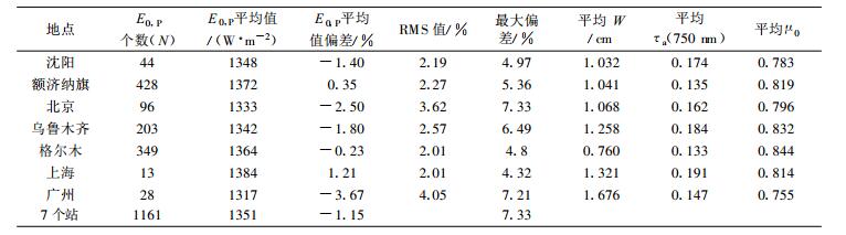 3 我国气象台站总辐射资料准确度评估应用上面论述的方法, 本章依据图 7和表 2对我国沈阳、额济纳旗、北京、乌鲁木齐、格尔木、上海和广州7个气象台站2000—2004年总辐射表探测的太阳短波总辐射的准确度进行评估。为计算宽带的总透过率要输入气溶胶光学厚度、谱分布、折射率、大气柱水汽含量和地表反照率。在计算中, 本文采用Ångström指数等于1的Junge气溶胶谱, 折射率假设为1.5-0.012 i, 750nm波长的气溶胶光学厚度τa (750 nm) 采用宽带消光法[12-13]反演的结果, 大气柱水汽含量W采用杨景梅等提出的一个经验模式从地面水汽压求取[14]。如上所述, 气溶胶光学厚度和大气柱水汽含量越小而μ0越大, 采用本文方法所确定的宽带总辐射透过率精度越高。但对这些参数过于限制, 可用的辐射资料又可能太少。资料太少, 输入的气溶胶参数和水汽含量随机误差对准确度评估的影响就会加大。此外, 在本评估方法应用中, 避免云的影响是至关重要的。基于这几方面的考虑, 本文所采用的辐射资料满足如下6个条件:①μ0 >0.7, 观测资料的时间段为10:00—15:00 (地方时, 下同) (一天最多5 h累积的总辐射观测数据); ② τa (750 nm) /μ0 < 0.3;③大气柱水汽含量W小于2.0 cm; ④ 08:00, 14:00和20:00云量观测值均为零 (无云); ⑤一天中10:00—15:00时段不存在由于没有太阳直接辐射的观测值及相应的气溶胶光学厚度反演结果; ⑥反演的 (10:00—15:00时段) 5个光学厚度的均方根偏差小于0.1。云光学厚度较小时, 来自云团的太阳短波天空亮度可明显大于无云情形下的值 (特别当气溶胶光学厚度较小时), 可使得所探测的总辐射明显大于无云时的值, 导致所推算的太阳常数偏大。天空中某一云团的光学厚度很大时, 来自它的太阳短波天空亮度可明显变小, 导致总辐射变小、太阳常数反演值偏小。10:00—15:00, 只有14:00气象台站有云量观测记录。即使08:00, 14 :00和20:00天空云量都为零, 在10:00—15:00中某些时段也可能存在云。本文在评估中采用对应小气溶胶光学厚度的晴天辐射资料。如果某些时段存在云, 对应的气溶胶光学厚度反演结果会明显大于无云时的值, 5个光学厚度的偏差会变大, 甚至出现光学厚度反演结果少于5个的情形 (即某些时段无太阳直接辐射)。基于这一分析, 本文计算一天中5个光学厚度反演值的均方根偏差, 如果该偏差较大, 估计可能存在云的影响, 对偏差大于0.1的辐射资料不予采用。如果光学厚度反演结果少于5个, 也不予采用。这后两个约束条件是为了剔除在气溶胶光学厚度反演中可能有云影响的数据。如果在这5 h内, 太阳周边无云, 但天空中有一些云团, 就不能用这两个判据加以判断, 而这些云团的存在会使E0, P反演值明显偏大或偏小。此外, 应用经验模式从地面水汽压确定的某些实时大气柱水汽含量也可能存在较大误差, 导致太阳常数反演值有较大的偏差。为了尽量避免这些值, 对5年中所有满足上述条件的E0, P值求平均, 对该平均值的偏差大于5%的样本予以剔除, 采用迭代进行这一剔除过程, 每次剔除一个偏差最大的样本, 再对剩下的样本求平均, 直到最大偏差小于5%。就7个站总体统计而言, 所剔除的资料只占总数的7.7%。