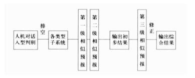 2.2 系统的预报流程进入相似预报流程之前, 先对待报个例进行入型判别。一般地, 预报员对天气形势的认识比较一致。通过人机对话方式, 系统利用预报员的经验优势进行排空处理, 由预报员将待报日天气实况进行大尺度天气形势分型。确定其所属的大类型之后, 以预报当日样本进入所属类型的相似预报流程进行预报。由前两级相似试验给出初步预报结果, 引入第三级预报进行模式修正。前两级相似都报预报当日出现暴雨, 则认为该日预报区里出现暴雨; 否则认为不出现暴雨。引入第三级试验后的修订预报:两级或两级以上试验预报有暴雨, 该预报日预报区有暴雨, 按规定输出该日的预报结论 (暴雨落点、落时、雨量); 否则认为预报区内没有暴雨发生, 退出预报系统。预报模型的具体流程参见图 1。