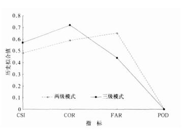 | 图 4. 相似预报试验中两级预报和三级预报的效果对比 (准静止锋型暴雨试验) Fig 4. The indexes contrast between double forecast and thrice forecast (quasi-stationary front pattern) | |
