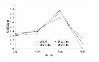 可以通过修正、调试对相似预报进行完善, 克服指标性能普通下降的不足。图 5中显示了3种调试方案, CSI值、COR值得到提高, FAR值也有所下降, 第3种方案将漏报率降为0。总体来讲, 对模型的修正是成功的。