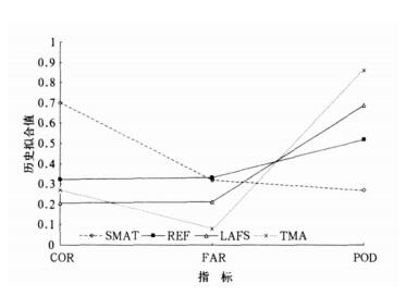 与他人所作工作比较 (CSI在0.35左右), 本文采用综合多级相似技术作各种天气形势的暴雨预报试验研究, 修正后预报模型的平均CSI为0.392, 提高了4%。同时, 从图 6可知 (SMAT代表综合多级相似技术, REF代表预报员预报, LAFS代表中国数值预报, JMA代表日本数值预报), 相比之下, 就模型的准确率、漏报率而言, 该模型也有优势。只是在空报率上, 没有体现出明显优势。总体而言, 综合多级相似技术具有较强的平均预报能力。