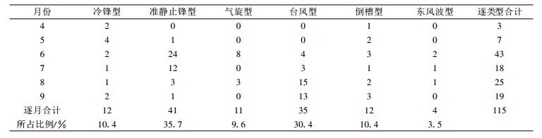 表 1给出了1990—2001年各类型天气发生暴雨的统计结果, 由此可分析出预报区内暴雨的分布特征 (预报区内暴雨年际、月际分布图略)。区域性暴雨平均每年出现11次, 其中2000年出现15次, 为最多年份; 1992年、1996年、2001年都只出现了9次, 为最少年份。区域性暴雨主要出现在6—9月, 其中6月出现次数最多, 共43次, 出现频率为2.75次/月; 最少是2月, 没有出现; 其次是1月和12月, 仅出现了1次。台风型暴雨和准静止锋型暴雨是该地区常见的暴雨形式, 所占比率都超过30%。因此本文研究时段选为每年的4—9月。
