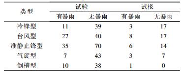 表 2 各种类型暴雨参加试验与试报情况统计 Table 2 The trial and test informations of various pattern rainstorm |