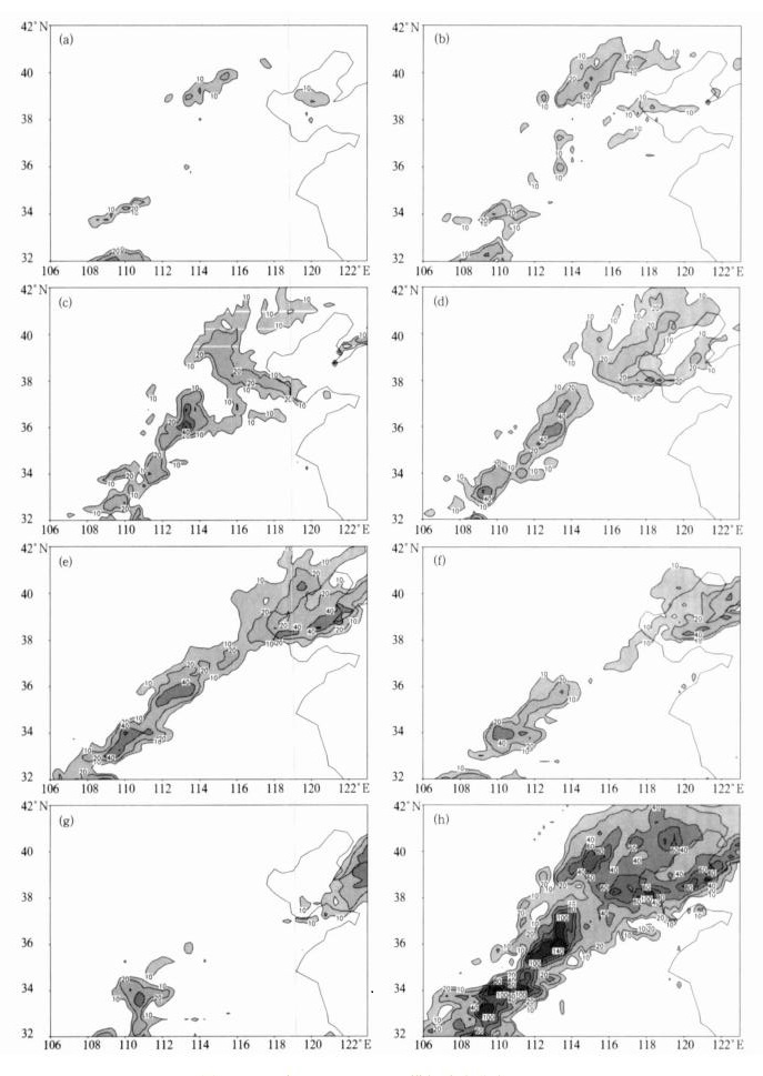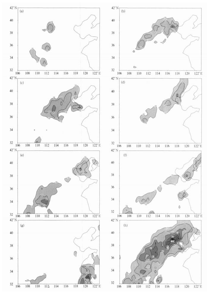 | 图 1. 2005年8月16—17日降水实况 (单位: mm) (a)16日02:00—08:00, (b)16日08:00—14:00, (c)16日14:00—20:00, (d)16日20:00—17日02:00, (e)17日02:00—08:00, (f)17日08:00—14:00, (g)17日14:00—20:00, (h)16日08:00—17日08:00 Fig 1. Observed rainfall during August 16—17, 2005 (unit:mm)(a)02:00—08:00 on Aug 16, (b)08:00—14:00 on Aug 16, (c)14:00—20:00 on Aug 16, (d)20:00 on Aug 16—02:00 on Aug 17, (e)02:00—08:00 on Aug 17, (f)08:00—14:00 on Aug 17, (g)14:00—20:00 on Aug 17, (h)08:00 on Aug 16—08:00 on Aug 17 | |