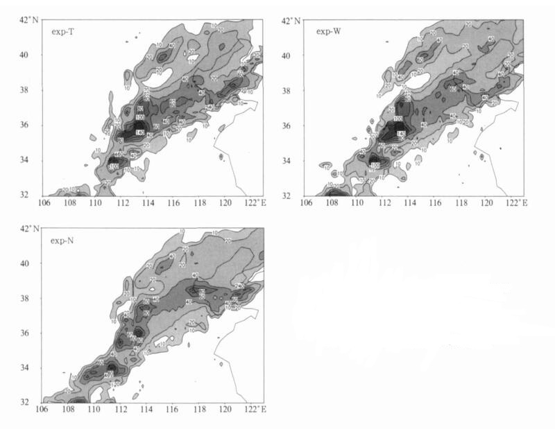 由于模式同时使用了显式方案和对流参数化方案, 因此模拟的总降水由显式方案降水和对流参数化方案降水两部分构成。图 4显示了exp-C, exp-T, exp-W, exp-N试验模拟的显式方案降水和对流参数化方案降水, 可以看出, 二者均占有重要比例。CAMS模拟的显式方案降水和对流参数化方案降水均呈东北—西南走向, 降水中心位置基本一致, 在渤海地区降水以对流参数化方案为主, 这与其他3个方案类似, 而在渤海以北地区, CAMS方案模拟的显式方案降水和对流参数化方案降水均有贡献, 而其他3个方案降水基本以显式方案为主, 对流参数化方案所占比例很少。从4个方案的降水分布来看, CAMS方案的显式降水与对流参数化降水的配合要略好于其他3个方案。