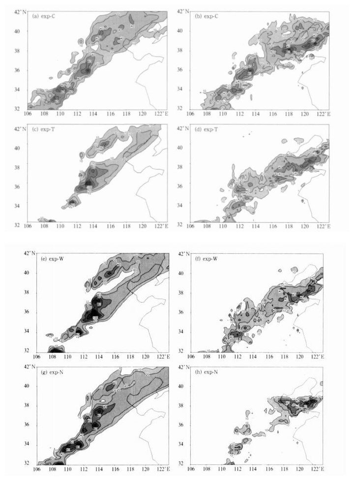 1) 没有进行同化资料处理和地面探空资料订正的情况下, 能够模拟出与实况相接近的雨带走向分布特征和暴雨中心的强度, 但大暴雨中心的位置模拟结果不理想, 这需要进一步改进。