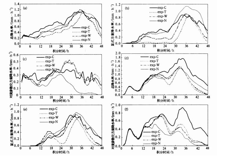 对总降水量、显式方案降水和对流参数化降水的每小时降水率分别进行了区域平均, 区域选取分别为32°~35°N, 106°~115°E和35°~42°N, 115°~123°E, 即将雨带分成西南和东北两个部分。如图 5所示, 对于雨带西南部分, 4个试验在前6 h内的总降水演变保持一致, 这是由于此时段内的显式方案降水很小接近于0, 而对流参数化降水基本一致。由于模式的云物理变量初始值为0, 物理过程和动力过程经过一段时间的调整才形成降水, 由此看来, 前6 h可认为是显式方案降水的启动时间。此后, 4个试验的总降水随时间持续增长, 在第30~36小时出现峰值, 而后下降。4条曲线变化趋势基本一致, 不同方案的降水量值有一定差别。4个试验的显式方案降水表现出与总降水相同的变化, 即先持续上升再略有下降。4个试验的对流参数化降水率曲线比较起伏, 变化趋势基本相似。对于雨带东北部分, 4个试验也是在前6 h内的总降水演变保持一致, 显式方案降水很小接近于0, 为启动时间。总降水在第30~36小时出现峰值, exp-C试验的总降水比其他3个方案略大, 而显式方案变化与其他方案差别不大, 总降水偏大是由于exp-C试验的对流参数化降水在后期比其他方案大造成, 这与图 4的分析结果相对应, 在雨带东北部分其他3个方案的对流参数化降水偏少。总的来看, exp-C试验对降水总体演变的模拟与其他3个试验基本一致, 不同方案的降水量存在一定差别。
