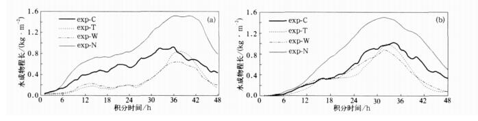 为了比较CAMS方案与其他方案云物理变量的模拟结果, 对4个试验的水成物程长 (水成物比质量加权垂直积分) 进行了区域平均, 区域选取分别为32°~35°N, 106°~115°E和35°~42°N, 115°~123°E。如图 6所示, 水成物程长随时间的变化与降水随时间的变化趋势基本一致, 先持续上升再略有下降。exp-C曲线与exp-T, exp-W接近, exp-N水成物增加速度大于其他3个试验。