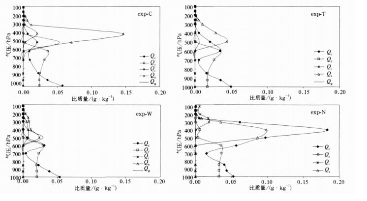 从水成物程长的分布可以看出CAMS方案与其他方案的结果比较一致, 水成物程长体现的是所有水成物在垂直方向的累积值, 而不同的水成物其垂直分布存在不同的特征, 因此下面分析exp-C试验水成物垂直分布结果, 并与其他3个试验进行比较。图 7为4个试验的水成物对48 h和区域平均后的垂直分布, 区域选取为32°~35°N, 106°~115°E, 即雨带西南部分。模拟结果显示零度层高度位于550 hPa, 从exp-C试验的水成物垂直分布可看出, 雨水分布在零度层以下的暖区, 云水除主要位于暖区之外, 在零度层附近的冷区存在过冷云水, 冰晶、雪和霰主要分布在冷区, 冰晶的大值区位于400 hPa, 雪的大值区位于400~500 hPa, 霰的大值区位于500 hPa, 与过冷云水的分布相一致, 在零度层附近的暖区存在少量没有融化的雪和霰。对比4个试验的水成物垂直分布, 其雨水的分布非常一致, 位于零度层以下的暖区, 在冷区也都有过冷云水存在, 而exp-N试验的过冷云水偏大, 这与exp-N试验不考虑霰有关, 霰的形成需要消耗过冷云水。4个试验的冰晶、雪和霰 (exp-N试验不含霰) 都集中在冷区, exp-C, exp-T和exp-N试验对雪的模拟值大于冰晶, 并且少量雪存在于零度层附近的暖区。exp-C和exp-W试验中霰的结果相接近, 在零度层附近的暖区也都存在少量没有融化的霰。与此同时也可看出, 4个试验水成物模拟的量值不完全相同, 不同的方案由于考虑水成物转化标准的定义存在差别, 微物理过程计算公式不尽相同[13-15], 从而导致水成物计算结果的大小有一定差别。雨带东北部分区域平均的水成物垂直分布与此基本类似 (图略)。总的来说, exp-C试验的水成物模拟结果合理, 垂直分布与其他3个试验的总体特征能够基本一致。