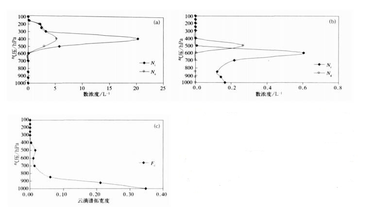 | 图 8. exp-C试验的水成物数浓度和云滴谱拓宽度48 h内32°~35°N, 106°~115°E区域平均的垂直分布 (a) 冰晶数浓度和雪数浓度, (b) 雨滴数浓度和霰数浓度, (c) 云滴谱拓宽度 Fig 8. The vertical distribution of number concentration of exp-C averaged in 32°—35°N, 106°—115°E in 48 h (a) number concentration of ice and snow, (b) number concentration of rain water and grapel, (c) the broadness of cloud droplet spectrum | |