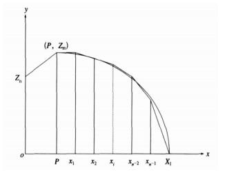 为了计算方便, 可以把曲面化成n个小平面, 当n取较大值时, 即可逼近曲面, 见图 1[10]。n值大小可任意设定, 一般跨度为8 m左右的温室, 取n=40足够, 本文中n=30。
