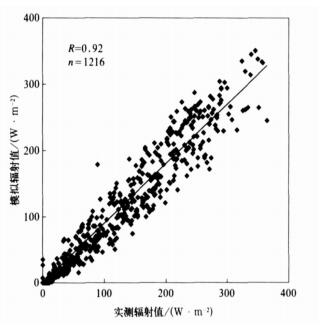 | 图 2. 地面辐射模拟值和实测值相关图 Fig 2. Comparison between of simulated radiation and the actual radiation on ground in greenhouse | |