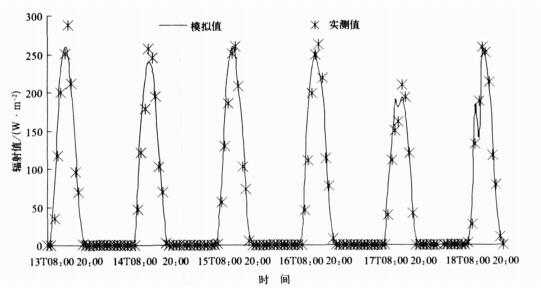 本文模拟了2004年1月12日-3月3日辐射在温室内部的分布状况, 图 2为模拟检验结果, 相关系数达到了0.92。图 3显示了2004年1月13日08:00(北京时, 下同)-1月18日18:00的地面得到辐射的模拟值与实测值相比较的情况, 平均绝对误差为9.41 W/m2, 从图中可以看出, 模拟值与实测值的动态变化比较一致, 模拟效果较好。