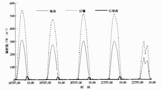 由2004年1月18日07:00-1月22日17:00温室中地面、后墙和后屋面得到的辐射对比 (图 4) 可以看出, 地面和后墙得到的辐射变化趋势相同, 后墙单位面积得到的辐射量高于地面。这与理论上的结论也是一致的。而后屋面得到的辐射量很少。