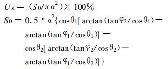 2.4 日光温室的散射辐射分布中国式日光温室可看作1/2个天球面受光的温室, 采光曲面可以分为若干个带状倾斜窗户, 设一个带状窗户的上下两个长边与地面平行, 且对室内某点P的仰角分别为θ1, θ2, 再把带状窗户划分为若干个小窗户, 令小窗户的两个侧边对P点所形成的方位角分别为φ1和φ2(以脊向处为0), 对于θ1, θ2和φ1, φ2所划定的小窗户I, 其对P点的天空率Usi的计算方法如下[7]: