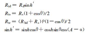 式 (1)~(2) 中, Rtotal为采光面接受到的太阳辐射量, Rtd为采光面接受到的太阳直接辐射量, Rts为采光面接受到的太阳散射辐射量, Rtr为采光面接受到地面和地上物体的反射辐射量, Rd为地面上垂直于太阳法线面的直接辐射量, Rhd为地面水平面的直接辐射量, Rs为地面水平面的太阳散射辐射量, 单位均为W/m2; h′为采光面上的太阳高度, h为太阳高度, A为太阳方位角, θ为采光面对地面水平面的倾斜角, α为采光面的方位角, ρ地面和地上物体的平均反射率, 京郊可取值为0.18。