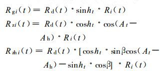 式 (9) 中, Rgi (t), Rzi (t), Rzhi (t) 分别为t时刻第i个小平面在地面、后墙面和后屋面上的透过直接辐射量。Rd (t) 为t时刻法线方向上的直接辐射量, Ri (t) 为t时刻第i个小平面的直接辐射透过率, 它是透明覆盖材料本身的透过率、骨架阴影、污染程度、边框胶条面积率等因素的函数, At为t时刻太阳方位角, β为后屋面与水平面的夹角, ht为t时刻太阳高度角, Ah为温室的方位角, 取值为0。