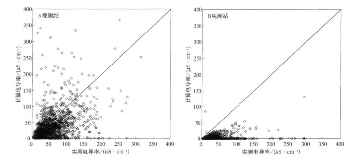 2.3 K-pH不等式在酸雨观测站的现场应用图 1分别点绘出两个酸雨观测站的实测电导率和根据降水pH值计算的K H+ +K OH-数值。可以明显看出, 除个别数据点外, B观测站的实测电导率明显大于K H+ +K OH-, 两者的关系较好地符合不等式 (4);而且电导率越大, 两者的差距也越大, 说明H+离子和OH-离子以外的其他离子成分对降水的电导率有明显的贡献。A观测站有相当数量的实测电导率数据小于KH+ +K OH-, 不符合不等式 (4), 这部分数据可能存在明显的测量误差, 这种误差既可能来源于pH值的测量, 也可能来源于电导率的测量。