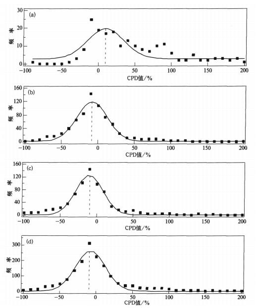 在我国已经运行多年的4个大气本底站, 即瓦里关、上甸子、临安和龙凤山本底站上, 降水化学观测内容除了现场测量降水pH值和电导率之外, 还在中心实验室分析降水中的主要离子成分, 包括SO42-, NO3 -, Cl-, NH4 +, K+, Na+, Ca2+和Mg2+[3]。由本底站1996年以来的1676个降水样品的离子成分分析数据和pH值、电导率的实测数据, 根据式 (1) 和式 (2) 计算了CPD值。为了研究不同pH值范围降水样品CPD值的偏差及离散程度, 将pH值≤4.0, 4.0 < pH值≤5.6, pH值>5.6的样品和所有样品分别进行了频率统计, 并用高斯函数对频率分布数据进行了拟合, 结果见图 2。由图 2a~c可见, 各pH值范围的CPD值频率比较离散, 但接近高斯分布。表 5归纳了4个大气本底站CPD值的统计特征值, 并给出超出US-NADP标准范围的数据比例。