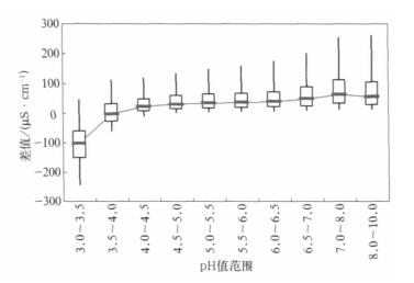 | 图 3. 实测电导率和K H++K OH-的差值分布随pH值的变化 (竖线表示中心90%的数据分布范围, 方框表示中心50%的数据分布范围, 中间横线表示中值) Fig 3. The differences of measured conductivities with K H++K OH- in different pH values (vertical lines denote the ranges of central 90% data, the squares denote the ranges of central 50% data, the bars denote medians) | |