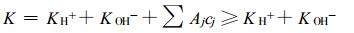 降水中存在3类电解质:酸、碱和盐。酸性电解质在溶液中电离生成H+离子和酸根离子, 碱性电解质电离生成OH-离子和非H+阳离子, 盐类电解质电离生成酸根离子和非H+阳离子。因此, 电导率的真值K可以表达为: