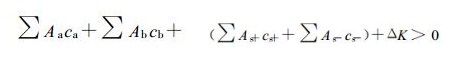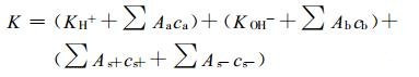 式 (7) 中的3个括号项分别为酸、碱和盐的电导率项, ∑A aca, ∑A bcb, ∑A s+cs+, ∑As-cs-分别表示酸性电解质酸根离子的电导率、碱性电解质非H+阳离子的电导率、盐类电解质的非H+阳离子和酸根离子的电导率。将式 (6) 和式 (7) 代入K-pH不等式 (式 (4)), 可得下式: