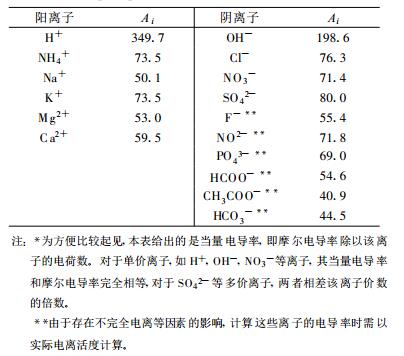 1 降水离子成分电导率的加和性质水溶液能够导电是因为其中含有带电荷的粒子, 这种粒子被称为离子。纯水的导电能力很弱, 当电解质溶解于水后, 水溶液的导电能力明显增强。水溶液中各种离子的导电能力具有加和性, 即水溶液的电导率K为水溶液中各离子的电导率之和[1, 9] :