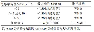 WMO标准和US-NADP标准的主要差别是, WMO按照不同的电导率范围划定最大充许CPD值, US-NADP则对电导率范围不加区分, 且容许更大的CPD值负偏差。由于目前普遍采用离子色谱法测量降水中的阴离子, 而降水中普遍含有一定量的碳酸盐成分和有机酸, 这些成分的阴离子不能被离子色谱法检出, 造成阴离子的缺测, 因此CPD值出现一定程度的负偏差是正常的。从这个角度看, US-NADP的标准更加适用于采用离子色谱法的分析结果, 而WMO的标准则可能照顾了不同的分析方法, 尽管区分了不同的电导率范围, 但是其标准却显过分宽松。我国的4个大气本底站的降水化学成分采用离子色谱方法分析, 因而US-NADP的检验标准更为合适。而且, 从我国的降水电导率测量结果看, 电导率≤5 μS/cm的降水极少, 电导率≤25 μS/cm的降水也只有1/4左右, 因此按照WMO的方式以电导率区分标准的实际意义不大。