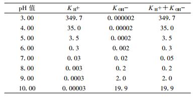 表 3给出了不同pH值时K H+, K OH-, K H+ + K OH-的理论数值, 可以看出, 当pH值小于6.00时, K OH-很小, 可忽略, pH值越小, K H+越大, 而且呈数量级递增; 反之, 当pH值大于8.00时, K H+很小, 可以忽略, 随着pH值增加, K OH-呈数量级递增。K H+ +K OH-随pH值的这种变化关系说明, 在pH值小于5.00或大于9.00时, 应用式 (4) 的校验效果会更加明显。由于实际的大气降水pH值较少超过9.00, 因此K-pH不等式也可以进一步简化为: