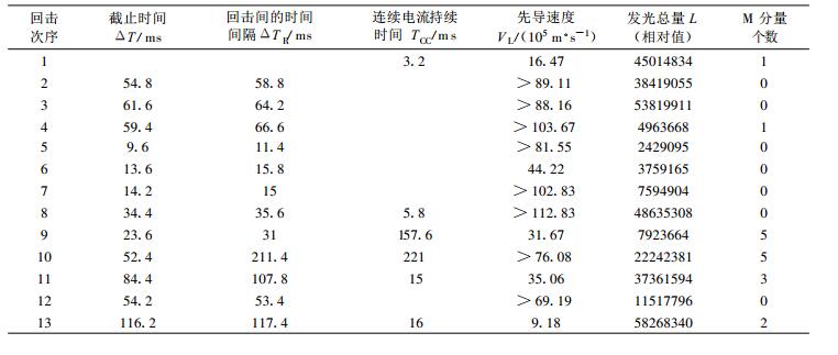 表 1给出了先导的平均速度, 观测所使用的数字化高速摄像机的时间分辨率为0.2 ms, 能够进行详细分析的先导过程有首次回击前的梯级先导, 第4次回击前的企图先导以及第13次回击前的直窜先导。其中, 在表 1中给出的是第4次回击前直窜先导的平均速度。