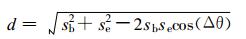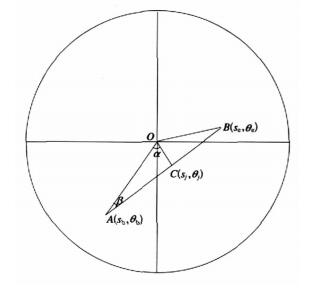 1.1 直线上任意点离雷达的水平距离和方位如图 1所示, 在雷达坐标平面上, O为雷达所在位置, AB是平面上任意一条线段, A为起点, B为终点, 它们离雷达的水平距离和方位坐标分别为 (s b, θ b) 和 (se, θ e), C为AB线上的任意一点, 它离雷达的水平距离和方位坐标为 (sj, θ j), 其中j为C点离A点的单位距离 (1 km) 数。在A点和B点的坐标 (sb, θ b) 和 (se, θ e) 已知的情况下, 下面计算C点的坐标 (sj, θ j)。