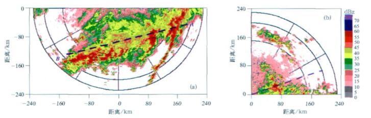 1 雷达反射率因子垂直剖面算法雷达反射率因子垂直剖面算法的基本步骤为: ①在屏幕的雷达图像上任意画一条直线, 已知直线起点和终点离雷达的水平距离和方位, 计算直线上每一点 (以1 km为间距) 离雷达的水平距离和方位; ②求剖面上每个格点在雷达极坐标中的方位、斜距和仰角; ③通过径向、方位上的最近邻居和垂直线性内插相结合的客观分析方法得到每个格点的反射率因子分析值。