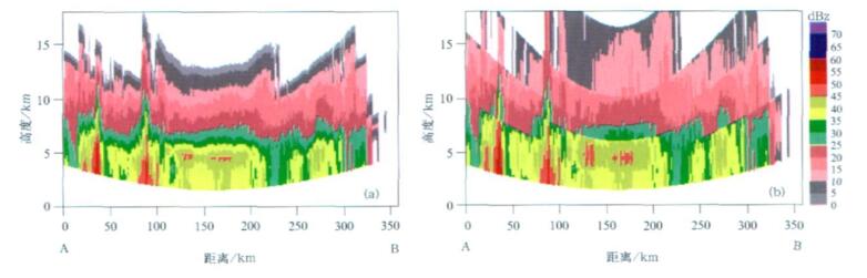 | 图 3. 沿图 2a中虚线AB的反射率因子垂直剖面 (a) 用dBZ插值, (b) 用Z插值 Fig 3. Vertical cross sections of reflectivity along dashed line AB in Fig. 2a (a) interpolation using dBZ; (b) interpolation using Z | |