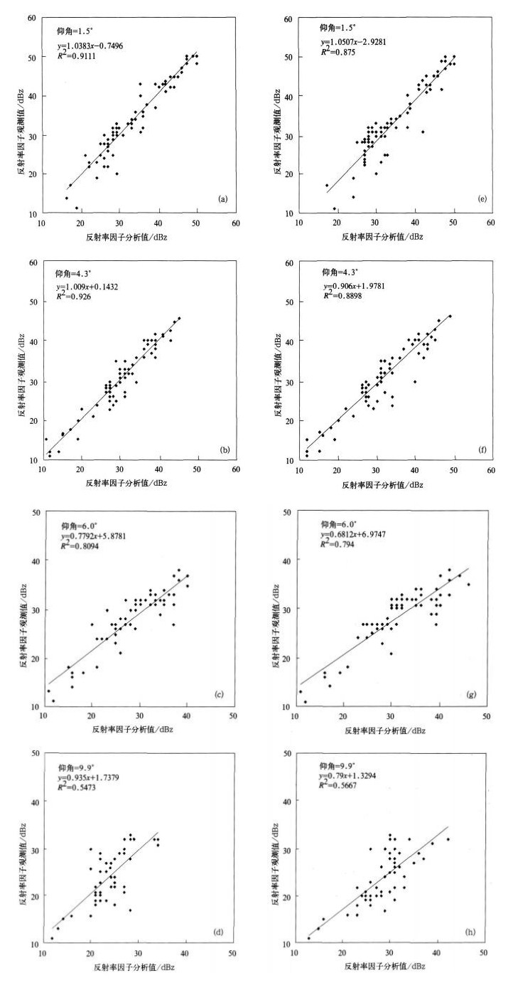 | 图 4. 图 2b中虚线对应的几个仰角的反射率因子分析值和观测值之间的散点图 (a)~(d) 用dBZ值插值, (e)~(h) 用Z值插值 Fig 4. Scatter diagram derived from the analysis and observation of reflectivities along dashed line in Fig. 2b at several elevation angles (a)-(d) interpolation using dBZ, (e)-(h) interpolation using Z | |