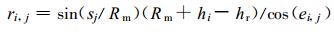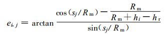 已知剖面长度坐标中的任意点离雷达的水平距离和方位 (sj, θ j), 那么就可求出剖面中的格点 (i, j) 在雷达极坐标中的仰角、方位和斜距 (ei, j, ai, j, ri, j), 其中i表示高度坐标中的第i个格点, i对应的高度为hi, j表示剖面长度坐标中的第j个格点。计算公式如下: