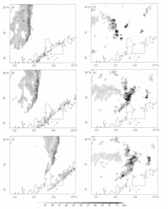 | 图 1. 云-地闪活动(各时次每10 min发生频数最大的云-地闪分布)及广州雷达回波特征(a)2005年3月22日10:00,(b)2005年3月22日11:00,(c)2005年3月22日12:00, (d)2004年6月20日19:00,(e)2004年6月20日20:00,(f)2004年6月20日21:00 (图中阴影区为雷达回波大于25 dBz的回波区; “ +”为正云-地闪记录, “-”为负云-地闪记录) Fig 1. Cloud-to-ground(CG)lightning activity(the hourly maximum 10-min CG flash rate)and the associated echo intensity as depicted by Guangzhou radar(a)10:00 on March 22, 2005,(b)11:00 on March 22, 2005,(c)12:00 on March 22, 2005, (d)19:00 on June 20, 2004,(e)20:00 on June 20, 2004,(f)21:00 on June 20, 2004 (shaded areas denote the echo intensity more than 25 dBz; a plus sign(+)and minus sign(-)indicate the position of a positive and negative CG flash) | |