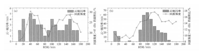 图 2给出了这两个雷暴系统随时间的演变情况, 为清楚起见, 图 2给出了所分析的3 h中, 每间隔20 min强度大于35 dBz的雷达回波区移动情况。分析时以相应时次的强回波中心为圆心, 50 km为半径作圆, 如图 2所示, 各圆基本上已将相应时次的强回波区都包括在其中, 然后对圆圈中云-地闪发生的记录和回波强度进行统计。其中系统强度主要是指对流回波的强度, 这里用圆圈中回波强度>45 dBz区域面积占圆圈面积的百分比来粗略表示。