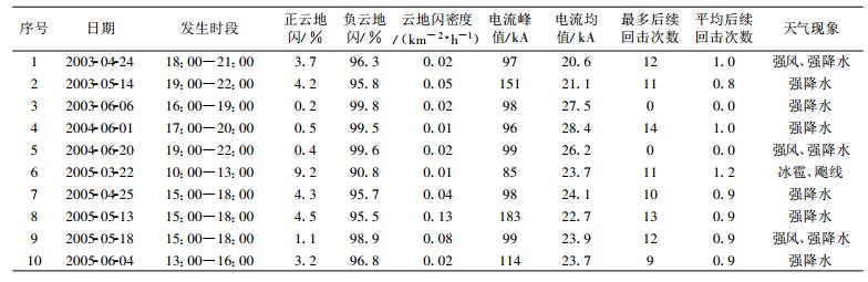 从广东省气候中心提供的由广州市观象台人工观测到的雷暴日记录出发, 并根据雷电定位系统提供的云-地闪观测记录, 将受对流系统影响时广州市附近约50 km范围内记录到超过50次云-地闪现象的雷暴日称为有云-地闪记录的雷暴过程, 而云-地闪记录不足50次的过程称为无明显云-地闪记录的一般对流天气过程。这是由于如果有云-地闪记录就记为1次有云-地闪记录雷暴过程, 则样本量将很大, 如从2001—2004年3—6月的统计数据看, 这样定义的有云-地闪记录的雷暴过程可达到307次, 与相应时段广州雷暴日的记录数不相符。但如按以上的方法进行划定, 定义的有云-地闪记录雷暴日为148 d, 与广州观象台记录到的雷暴日数135 d接近, 因此这样的定义还是较为合理的①。根据这一定义, 研究选取了2003—2005年3—6月发生在广州附近地区的两组有、无云-地闪记录的对流天气过程作比较分析, 其中包括10个有云-地闪记录的雷暴过程和10个无云-地闪记录的一般对流天气过程。表 1中给出了10个有云-地闪雷暴过程的具体情况。