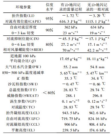 表 2 有、无云-地闪记录对流过程环境条件对比 Table 2 Comparison of environmental properties for lightning storms and non-lightning storms |