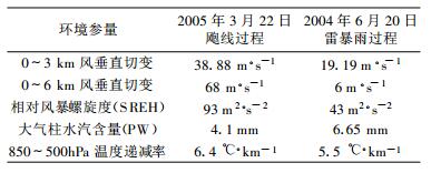 同样是有云-地闪记录的对流过程, 但强度不同时其环境条件特征也存在较明显差异。如前面曾讨论过的两个典型个例中, 飑线过程(一般雷暴雨过程)0~3 km的风垂直切变为38.88(19.19)m·s-1, 0~6 km的风垂直切变为68(6)m·s-1, 相对风暴螺旋度为93(43)m2·s-2。另外, 前者的大气柱水汽含量较低(41 mm), 而后者则较高(66 mm), 飑线过程在850 hPa和500 hPa之间具有更高的温度递减率(6.4 ℃·km-1), 与一般雷暴雨过程个例相差近1 ℃·km-1。因此可以这样说, 飑线过程(一般雷暴雨过程)发生在温度递减率相对较高(低)和具有更强(弱)垂直切变及更高(低)相对风暴螺旋度的环境场中(表 3)。