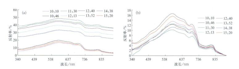 | 图 2. 2003年1月10日巢湖原始(a)与归一化(b)光谱反射率 Fig 2. The original(a)and normalized(b)spectral reflectance of light over Chaohu Lake on Jan 10, 2003 | |